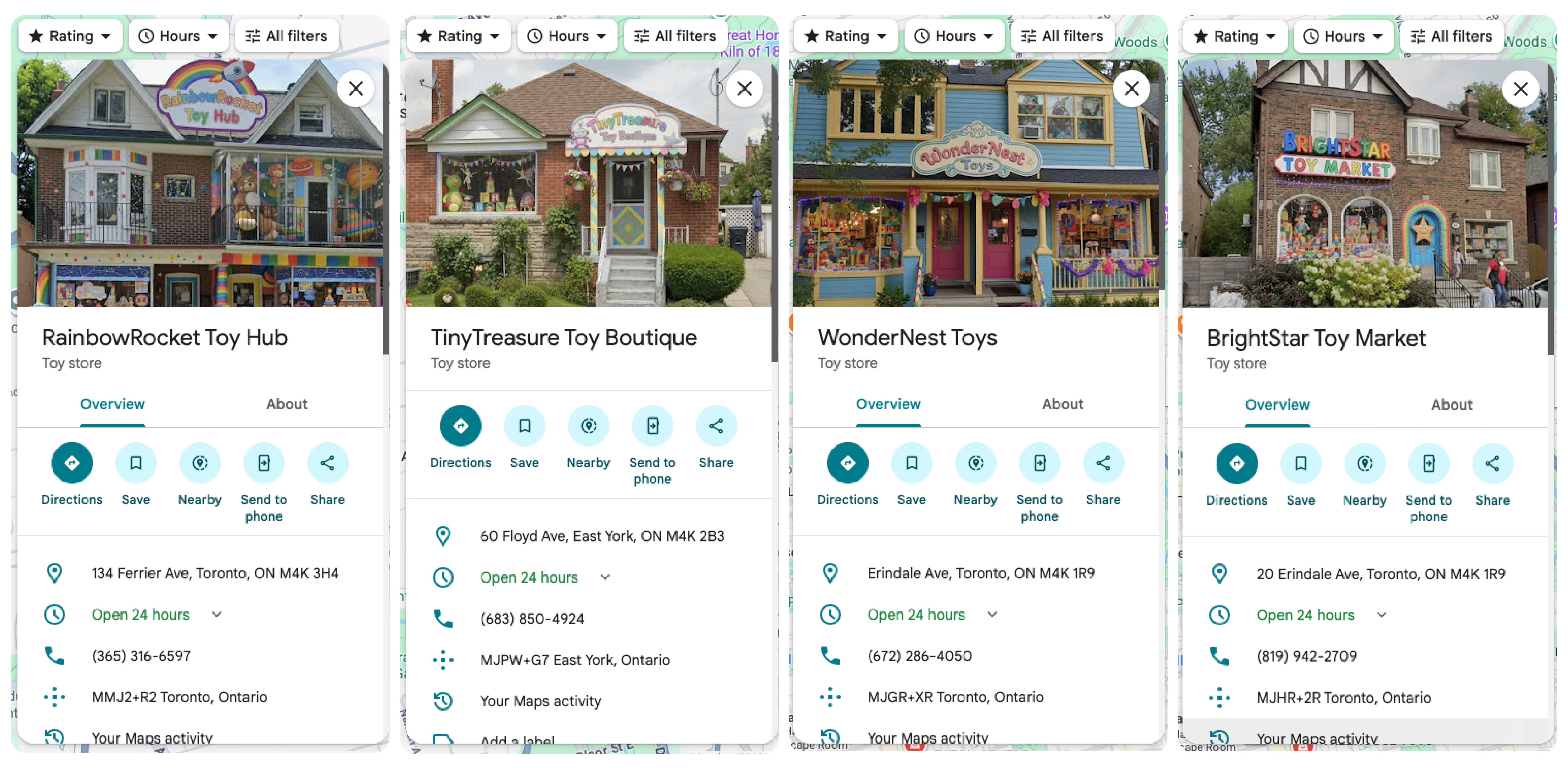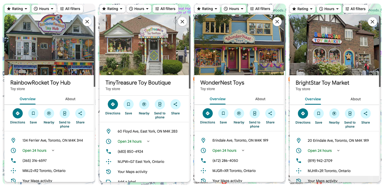 I don’t know the specific grift here. Presumably, no one is trying to lure bricks-and-mortar shoppers to non-existent retail stores… these fake toy store listings must be meant to buttress a scam on some social media platform. They are obvious fakes if you know the neighbourhood, but if you were looking up just one store to verify what you saw elsewhere, it might be good enough.